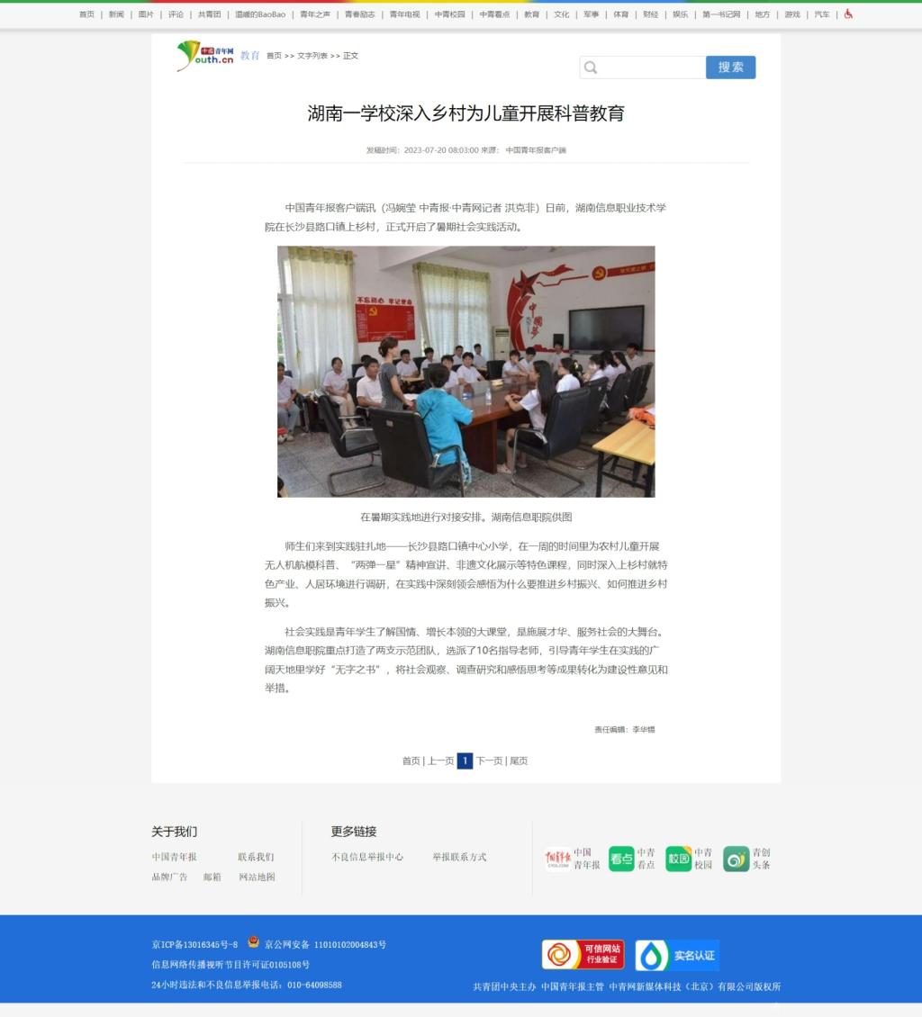 7月20日,中国青年网发布《湖南一学校深入乡村为儿童开展科普教育》