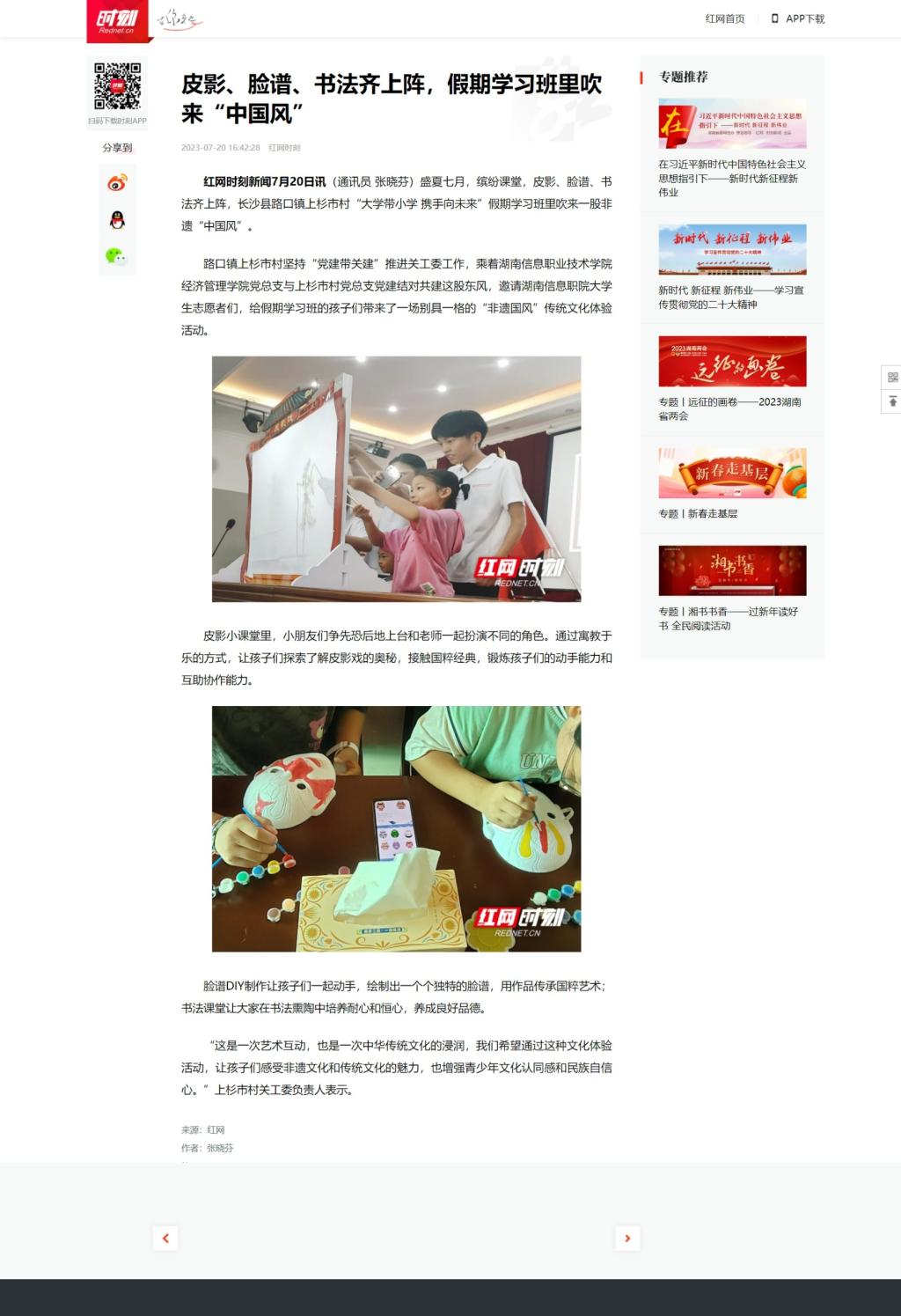 7月20日,红网发布《皮影、脸谱、书法齐上阵,假期学习班里吹来“中国风”》