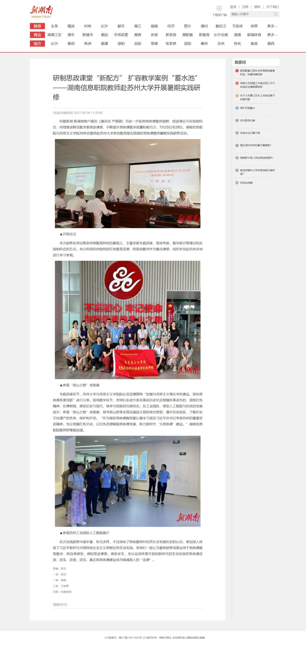 8月4日,新湖南发布《研制思政课堂“新配方” 扩容教学案例“蓄水池”——湖南信息职院教师赴苏州大学开展暑期实践研修》
