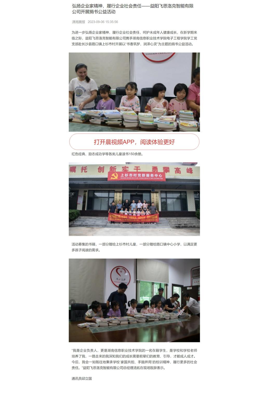 9月6日,晨视频发布《弘扬企业家精神,履行企业社会责任——益阳飞思洛克智能有限公司开展捐书公益活动》
