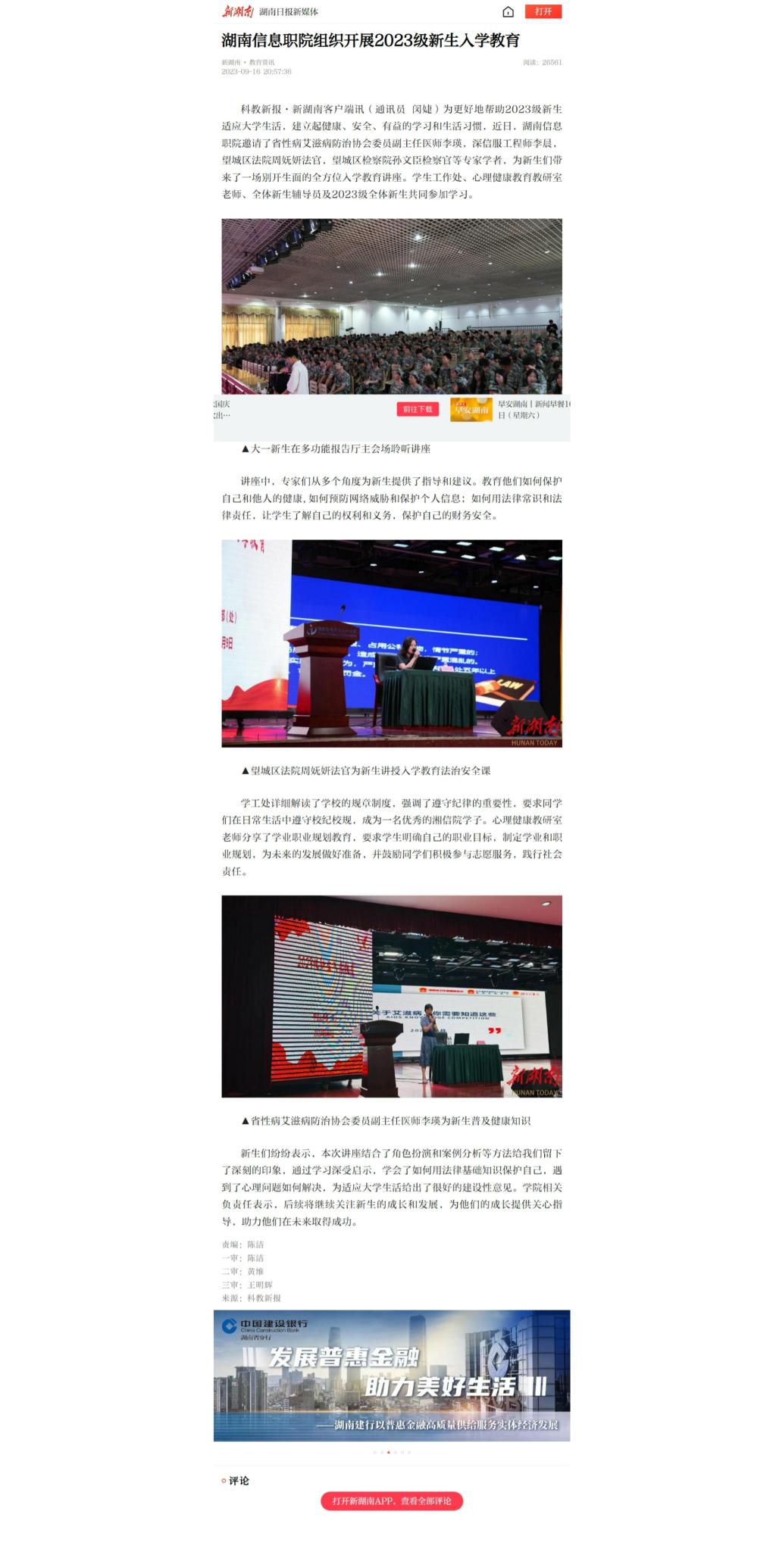9月16日,新湖南客户端发布《湖南信息职院组织开展2023级新生入学教育》