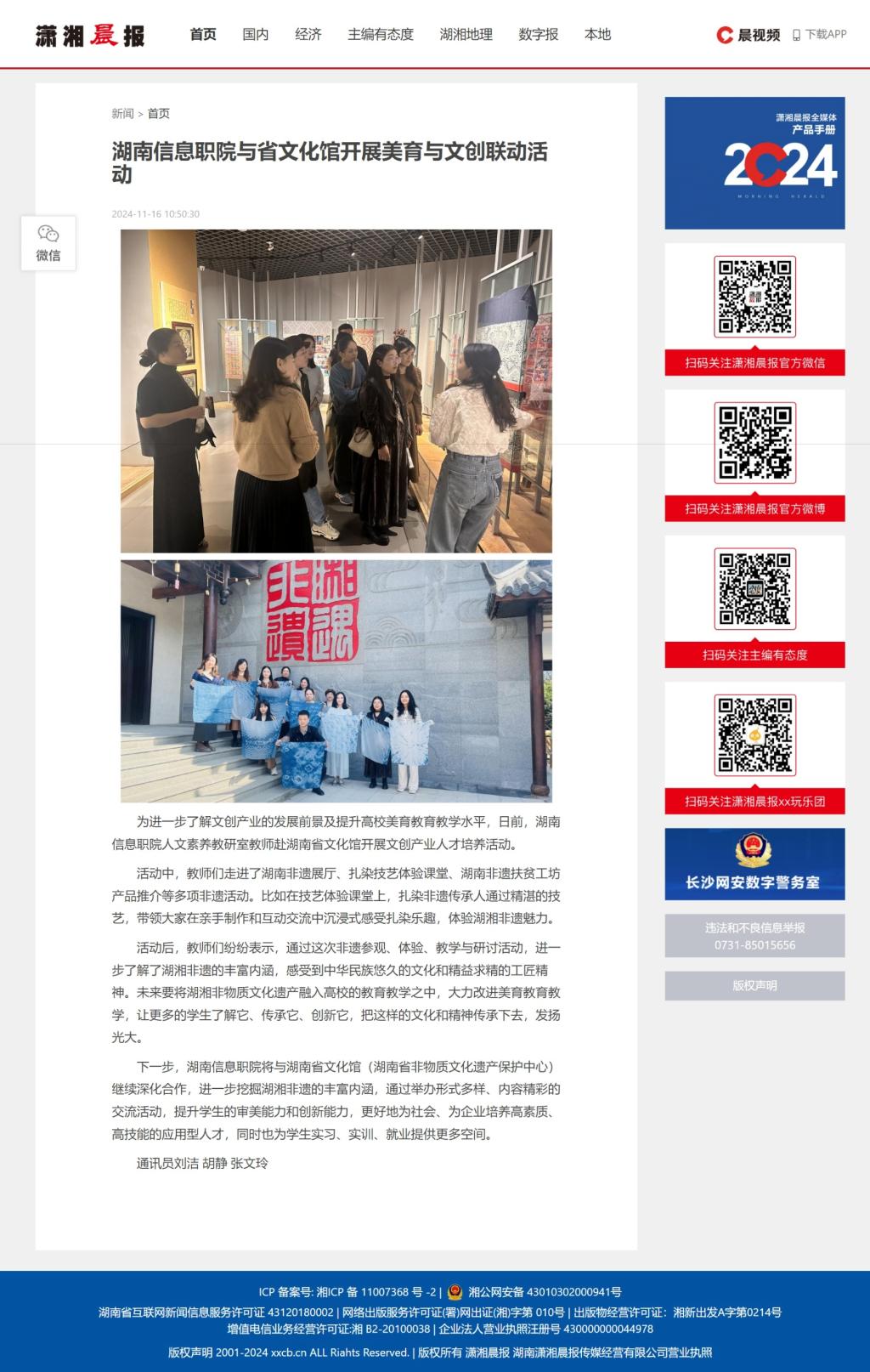 11月16日,潇湘晨报网发布《湖南信息职院与省文化馆开展美育与文创联动活动》